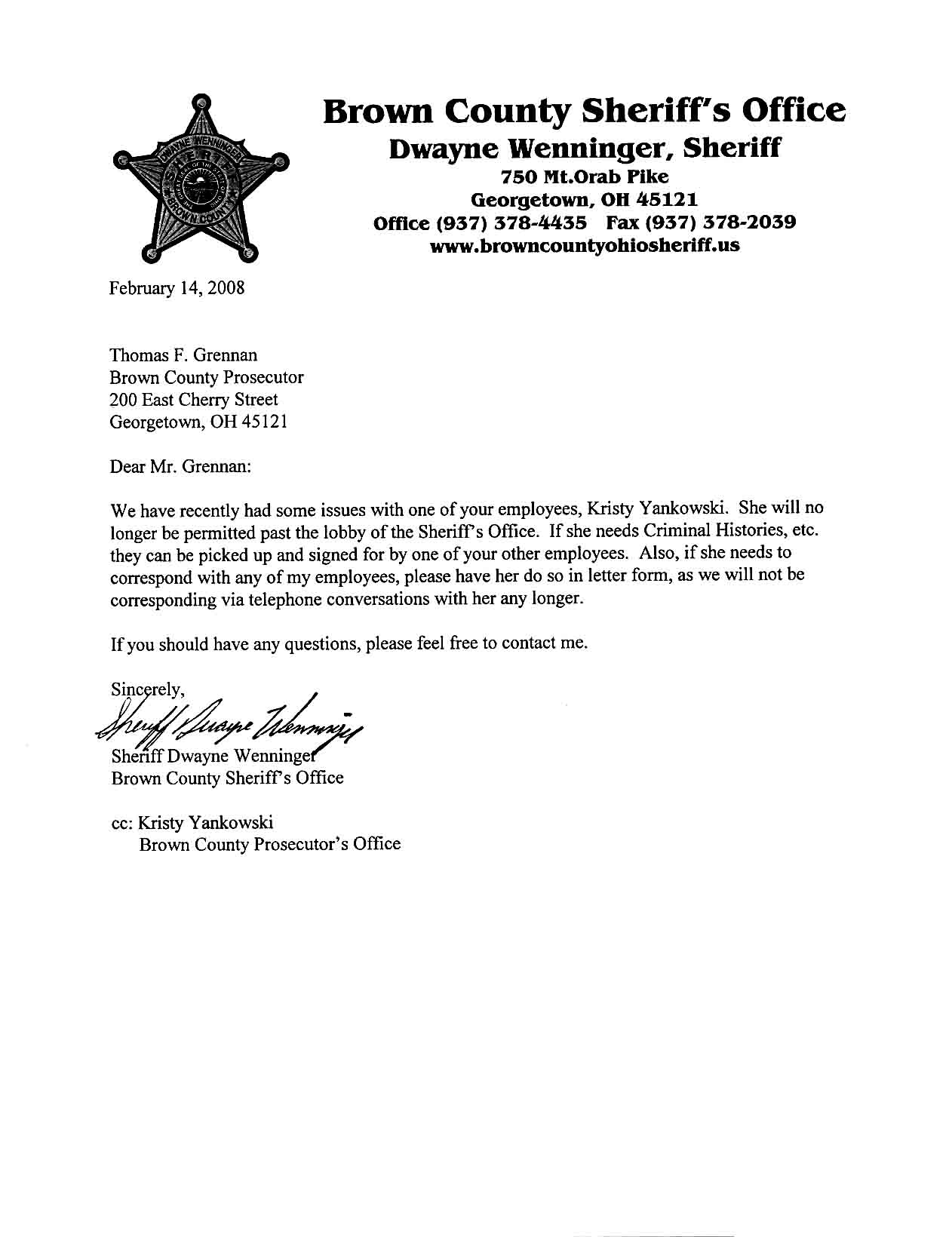 Fri 6/6/2008 11:07 AM: Question/Comment: WHERE DO I BEGIN? FIRST IF I WERE SHERIFF IN ANY OF THE 88 COUNTIES IN THIS STATE, I WOULD BE OUTRAGED, AND WANTING SOME ANSWERS AS TO WHY THE QUALIFICATIONS/STANDARDS HAVE BEEN LOWERED TO RUN FOR SHERIFF. THIS IS A SLAP IN THE FACE TO EVERY ONE OF THEM WHO MET THE QUALIFICATIONS, AND WORK HARD AT THIS JOB. THIS IS ALSO A SLAP IN THE FACE TO EVERYONE IN LAW ENFORCEMENT, WHO TAKES PRIDE IN WHO THEY ARE AND WHAT THEY DO! THE GALL OF A STATE SENATOR TO PULL SOMETHING LIKE THIS FOR THE BENEFIT OF ONE PERSON WHO CANNOT MEET THE QUALIFICATIONS, AND APPARENTLY ISN'T SMART ENOUGH TO FIGURE IT OUT ON HIS OWN IS APPALLING, AND UNACCEPTABLE. NEXT IF EVERYTHING ACCORDING TO WENNINGER, OR HIS LAWYER IS OKAY, THEN UNSEAL THE COURT DOCUMENTS, AND PROVE IT; ONCE AND FOR ALL. I BELIEVE THE CITIZENS OF BROWN COUNTY DESERVE TO KNOW, THAT IS IF THERE'S NOTHING TO HIDE! ALSO HOW ABOUT A DEBATE. LOTS OF LUCK WITH THAT, I DON'T THINK HE'D DO IT! DON Answers: Thanks, Don. Every sheriff in Ohio, except for four of them, received letters informing them of this situation. If they don't find anything wrong with it, I guess that is their decision. I agree with you on that. Making an amendment as a "carve-out" for just one person is unconstitutional. The facts and Senator Niehaus' own words clearly show that is exactly what was done for Mr. Wenninger. In one breath Senator Niehaus is saying that the hierarchy of the Republican Party in Brown County asked him to look into doing it, and then in the next breath he denies it was for Mr. Wenninger, but rather for anyone who needed it in the future - the future being 13 days later for Mr. Wenninger's educational credentials to then qualify as meeting the requirements when he filed his petitions. There are a lot of questions to be answered here, but no one seems to be digging for the answers. The case file really doesn't have to be unsealed to know what it says. Judge Ringland would not have given the jury anything to consider if there wasn't an issue with his qualifications in the first place. Why, there would never have even been an indictment if everything was satisfactory. |