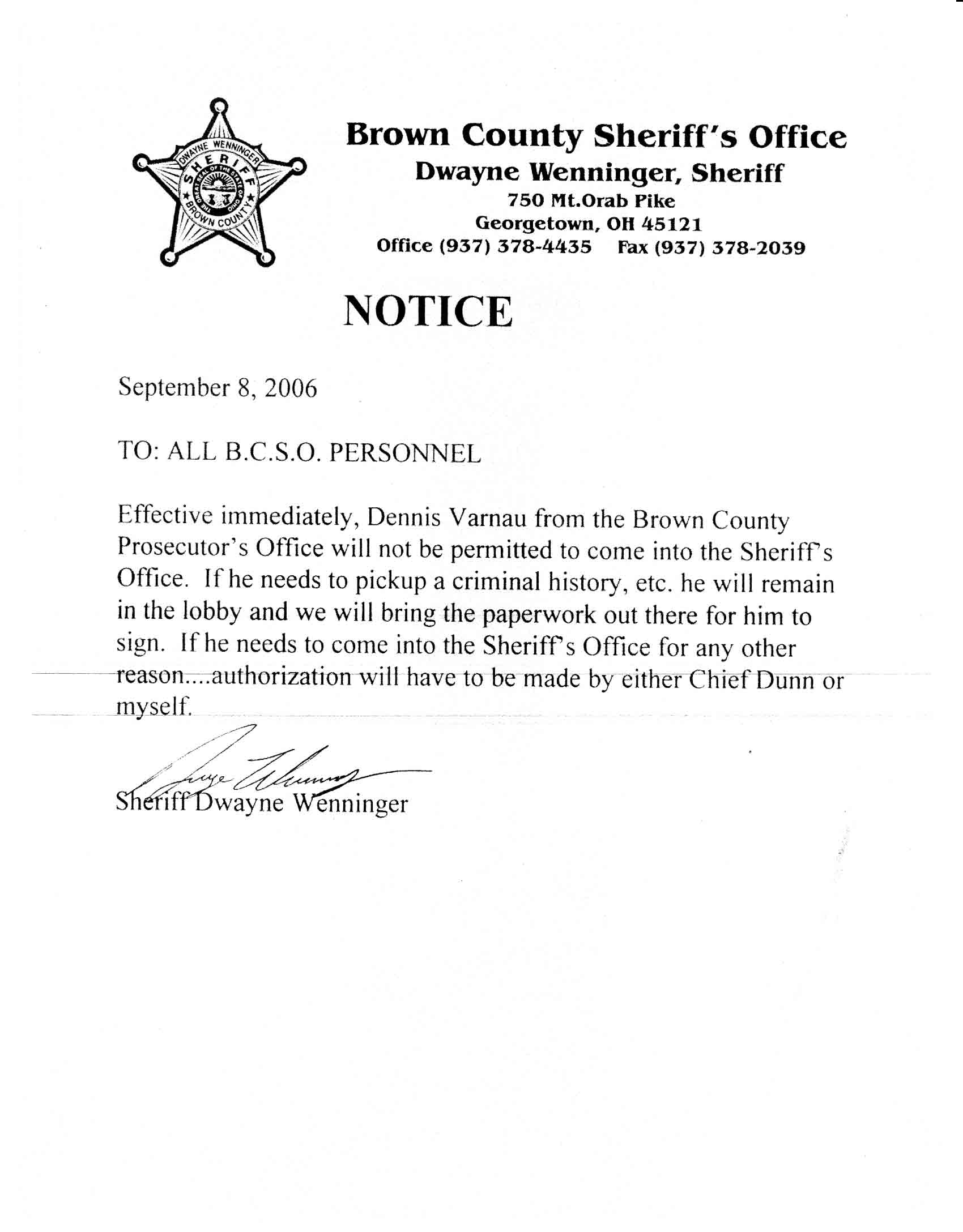 The Brown County, Ohio, Sheriff's Office? Answer: Thanks for your mail, Jay. If I am elected on November 4th, I'll make my final decision on just who will be in the top supervisory positions. At this time, I can say that I have had four individuals on my mind for the CD position. Obviously, the CD has to have the integrity, experience, dedication, and administrative experience to hold the position, and will most surely be a sworn peace officer, with a valid OPOTA certificate. I can tell you that will not be my opponent. What I am most concerned about is equal treatment, equal opportunity, and fair dealing, with all in the department when it comes to promotions, etc. That has to be done on a completely objective basis as much as humanly possible. There is no better way to destroy the morale of a department than to cater to cronyism or nepotism when it comes to promotions. I have friends and acquaintances that I know possess the integrity and honesty that I think is absolutely necessary to be a peace officer. These friends and acquaintances already know they are not going to be given any preference over anyone else already there, just because of my pre-existing relationship with them. Promotions will be considered according to objective standards and testing used by larger departments in our state. I am concerned about the pay our deputies make. There have to be some ways to increase pay across the board, but that will take some time to correct, particularly in light of the hard times coming with the dollar crashing, and county revenue dropping. I think budgets will be decreased before being increased, which means things have to be managed better to squeeze out the most of every penny available for yearly operations. This is where "teamwork" comes into play. If everyone is not on the same team to "protect and serve," then someone has to pick up the slack not carried by those slacking off. Management is the key word here. |