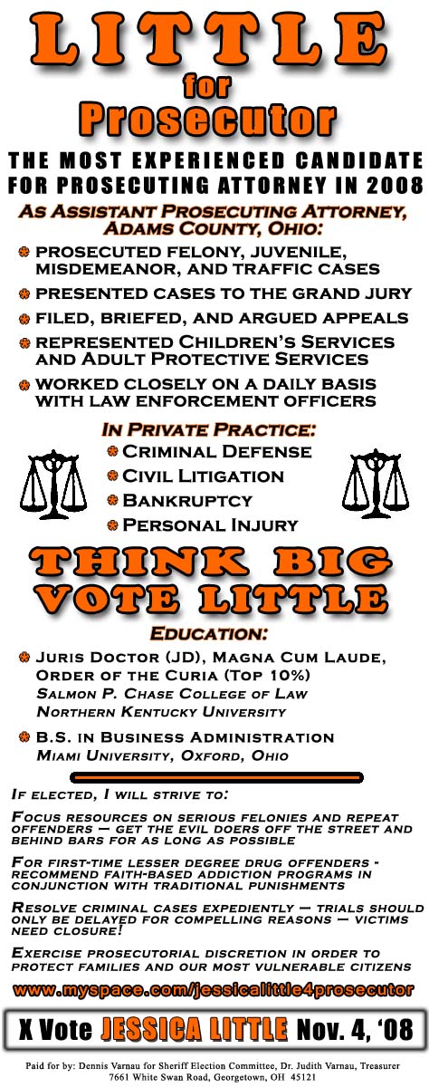 Attorney. Answer: Thank you for your letter, Jeff. The facts are crystal clear with respect to the experience levels between Mr. Rickey and Ms. Little when it comes to knowledge about being a "full-service" prosecutor. That's all I've been pointing out, up until NOW. I attended the Democrat Fall Dinner this last Friday. People presently in office were given the opportunity to address those attending. My ex-boss, Mr. Grennan, walked over to the microphone at the podium to address the crowd. He gave a passionate plea for everyone to vote a straight Democratic ticket to specifically get Mr. Rickey in as well as others. Mr. Rickey was one of the first to rise up to give Tom an enthusiastic standing ovation. Now, putting this into perspective, I have recently been hearing the rumor going around that Mr. Rickey is going to hire Mr. Grennan as his senior advisor/assistant prosecutor. I did not give this much credence because I know exactly what Mr. Grennan has said about Bob, not only when Bob left the prosecutor's office, but also when Bob ran against Tom, and after Bob won the primary. There was no love lost - I can assure you. I also know other things that have been said with respect to Mr. Grennan's plans prior to the election, and what he was considering after he lost the election, that is, after he blamed me and a couple of others for his loss in the primary. This rumor makes prefect sense, however, when you stop to think about it for a few minutes. There is not going to be much money available to get these government jobs done daily in light of the diminishing dollar, and since Mr. Rickey does not know how to completely run a prosecutor's office, or handle all the different areas alone, legally speaking, without having to learn on-the-job, being taught by someone how to do it, Bob is going to have to hire someone he can literally afford salary-wise to help him out to keep things going. What better solution than to have Grennan fill in for lesser pay with enough experience to keep the office working. After all, it was one of Tom's main goals to get "four more years" in on his retirement package. I can see a potential trade off of salary for extra time toward retirement as a positive cost/benefit decision in Grennan's mind, being totally acceptable to him. All that would have to be accomplished through Grennan's passionate plea is to get Mr. Rickey in office to realize the goal of having four more years of Grennan as the de facto prosecutor of Brown County. A past supporter asked why I had not contacted Bob to find out what his answer would be to this rumor before publishing it. First of all, as I point out, it was the rumor floating around the courthouse. I checked with someone I completely trust, and that person also said the same had already been heard too. I did not start the rumor myself. I had heard, while still working at at the prosecutor's office, and after I quit, many other rumors about how Bob would run the prosecutor's office and who he would supposedly fire after taking office if he won. Bob is a great attorney, in that you cannot read him at all, and hard to get a direct answer out of him, from my experience at the office during the short time he worked there in Municipal Court only. He did not do any felony common pleas court cases that I can remember, and surely no felony jury trials as a prosecutor. So, even if Bob denies now that he would not hire Mr. Grennan if he wins the election, that is now. By the time January rolls around, things will change, particularly with respect to the funding that will be available to hire a seasoned/experienced attorney who can handle felony cases in common pleas court and grand jury. It is a no-brainer to me that Mr. Grennan will be the best bang for Bob's minimal bucks at that time to hire Mr. Grennan at a lower salary, as a quid pro quo for Mr. Grennan to get his last four years in for his retirement. I can see that happening practically, as a matter of fact, no matter what Bob says at this time in the "game." All that would be available to the citizens of Brown County after that would be a recall movement. Time is too precious to waste, in my opinion, at this time playing these political games. We need the most experienced persons in each office that is available to take and do the jobs for the right reasons. It is still my opinion, that if you compare the experience levels of both candidates for prosecuting attorney, it is a common sense decision once presented with the facts. Jessica Little has the most experience to do the job without having to obtain any training to hit the office running. Her biggest headache will be trying to get things organized from the condition they were in when I worked there. During his passionate plea, Mr. Grennan also mentioned that he has served with "integrity" for his three terms in office. Well, I worked for Grennan for 3.5 years in the prosecutor's office as an investigator, and filling in on minimal attorney tasks, like plea and bond hearings, etc., when needed in juvenile, municipal, and common pleas courts. I worked for him for a pittance because I loved my job, and because I was doing it for our county citizens, him, and our office. I even know how I was told by him that I could not be replaced, etc., when I finally decided to leave back in September 2007. And what did I get in return? I got trashed by him in front of the Chiefs at a Chiefs' Meeting, blamed for losing his primary election, and now that I look back, probably just being "used," as others would regularly tell me during the time I worked there. I didn't care about being "used" or not, because I loved my job and chose to keep doing it even if being "used" as my work was helping people out. I'd do it all over again while being "used" because I genuinely looked forward to going to work every day, something I did not really appreciate in previous jobs over my lifetime. Nevertheless, the comment about "serving with integrity" almost made 