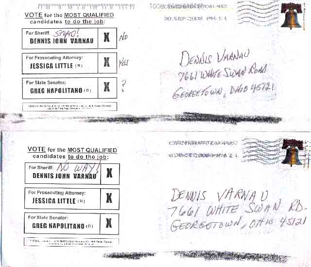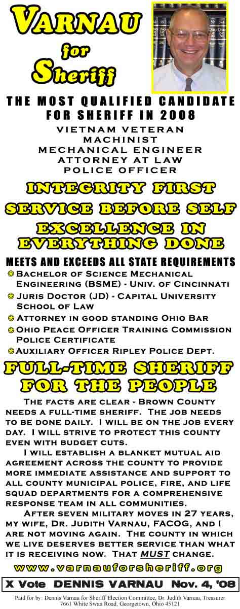Answer: Thanks, Marie, for your letter. I want to thank you for your support too. Since I do not accept any contributions, so that I can maintain my complete independence from having to "owe" anyone anything after the election, all I ask is for my supporters to spread the word about the website and my credentials. There are still people out there saying, "Who is this Varnau anyway," as if they have not seen one ad over the last two years in the newspapers, or taken the time to even try to find out anything about me, what I believe, or will do as sheriff. We'll never reach all of those that have to be "spoon-fed" information before they vote. Mrs. Herdman talks about "right and wrong," as if she is the epitome of "justice." All I can say is that either Senator Niehaus is lying, or Bill Herdman is lying about just who was involved in arranging for that amendment to be passed in the Ohio legislature solely for Mr. Wenninger's benefit. Don't we all wish Senator Niehaus would pass a special bill to help each and every one of us, so that each of us could get paid a stipend out of taxpayer money that we would only have to work eight hours a month for to supplement our other job income. All I can say is that everyone should listen to what Senator Niehaus has to say about it, and then they should be asking the Senator their own questions about it. Then they should be voting to remove him from office permanently. Everything that has been done by the Brown County Republican Party for the last 7.5 years, regarding Mr. Wenninger, has cost us county taxpayers through the nose, like a nosebleed that you can't stop even with silver nitrate sticks. I heard today that the "Big Dig" trial down in Cincinnati has dismissed all defendants except for "Sheriff" Wenninger and Sheriff Rodenberg of Clermont County. That means us taxpayers will save some money in this one since the county appears to have been dismissed as a defendant. Wait and see what happens if the plaintiff attorneys find out Mr. Wenninger is a civilian instead of a genuine Sheriff. Wonder how that possibly could affect his trial and liability. That trial concerns the violation of the Spangler's civil rights, very similar to the UDF incident where the "Sheriff" intimidated a lady on June 25th by threatening to press charges against her son if she did not remove my bumper sticker and yard sign, depriving her of her civil rights under 42 USC 1983, which is also a potential fourth degree felony under Ohio's election laws. Bev Herdman is more prone to eliminate or stifle my constitutional rights rather than remove a counterfeit "sheriff" from our midst. What does that tell you up front, without even having to think about it longer than the time it takes to read what she said? Here's my letter in response to hers in The News Democrat: What Varnau Thinks . . . [The News Democrat changed my submitted title to: "Varnau responds to letter writer." The News Democrat has a habit of changing the words in the originals as sent to them. The Brown County Press has not changed the text in anything I have sent to them.] To the editor: Bev Herdman’s letter to the editor in last week’s newspaper DEFINITELY is one for the political history books! The exercise of my political, free-speech rights would naturally be objectionable and offensive to those who thoroughly despise truth. Exposing “dirty politics,” practiced for years in Brown County, now threatens those involved in its practice, as evidenced by Bev’s letter. If you want to know what Dennis John Varnau thinks, and want to read about Brown County “dirty politics,” go to my website at www.varnauforsheriff.org. On that site you will find that Mr. Bill Herdman, Bev’s husband, and current member of the Board of Elections, was directly involved in the machinations underlying the unconstitutional amendment engineered by, now Senator, Tom Niehaus, back in 2003. That law reduced the educational credentials required for individuals to qualify as a valid candidate for sheriff. From March 12th through September 15th, anyone traveling south on Route 68 could infer that the billboard at the corner of Delhi-Arnheim and Route 68 was “MY” billboard. Anything on that billboard is approved by me, as in: “I approved this message.” Jessica Little had nothing to do whatsoever with me deciding to back her, other than she factually possesses WAY more experience as a prosecutor than Mr. Bob Rickey - her opponent. My support for Jessica Little does not automatically dictate a reciprocal relationship. I am exercising my constitutional right as a qualified elector to back her candidacy. What is “sneaky” and “unprincipled” to Mrs. Herdman exposes truths the Herdmans and Senator Niehaus would like to keep “secret.” For the complete story, you will have to access the comprehensive information posted on my website. Our county and its insurer will probably end up paying in excess of a million dollars in settlements as a result of all the lawsuits against the current “sheriff.” That’s our tax money being unnecessarily wasted for absolutely nothing in return. “Justice” will be served when those who are responsible, for perpetuating the fraud of concealing an unqualified candidate in office, are legally forced to reimburse the losses realized by our county as a result of "their" unqualified “sheriff’s” decisions. I sure hope, for the sake and safety of our county, that Jessica Little is elected as prosecuting attorney. After interviewing her four times, I know that she can “hit the road running.” She will not require an extended apprenticeship to learn how to do the whole job, as would her opponent, in my opinion. Dennis John Varnau |